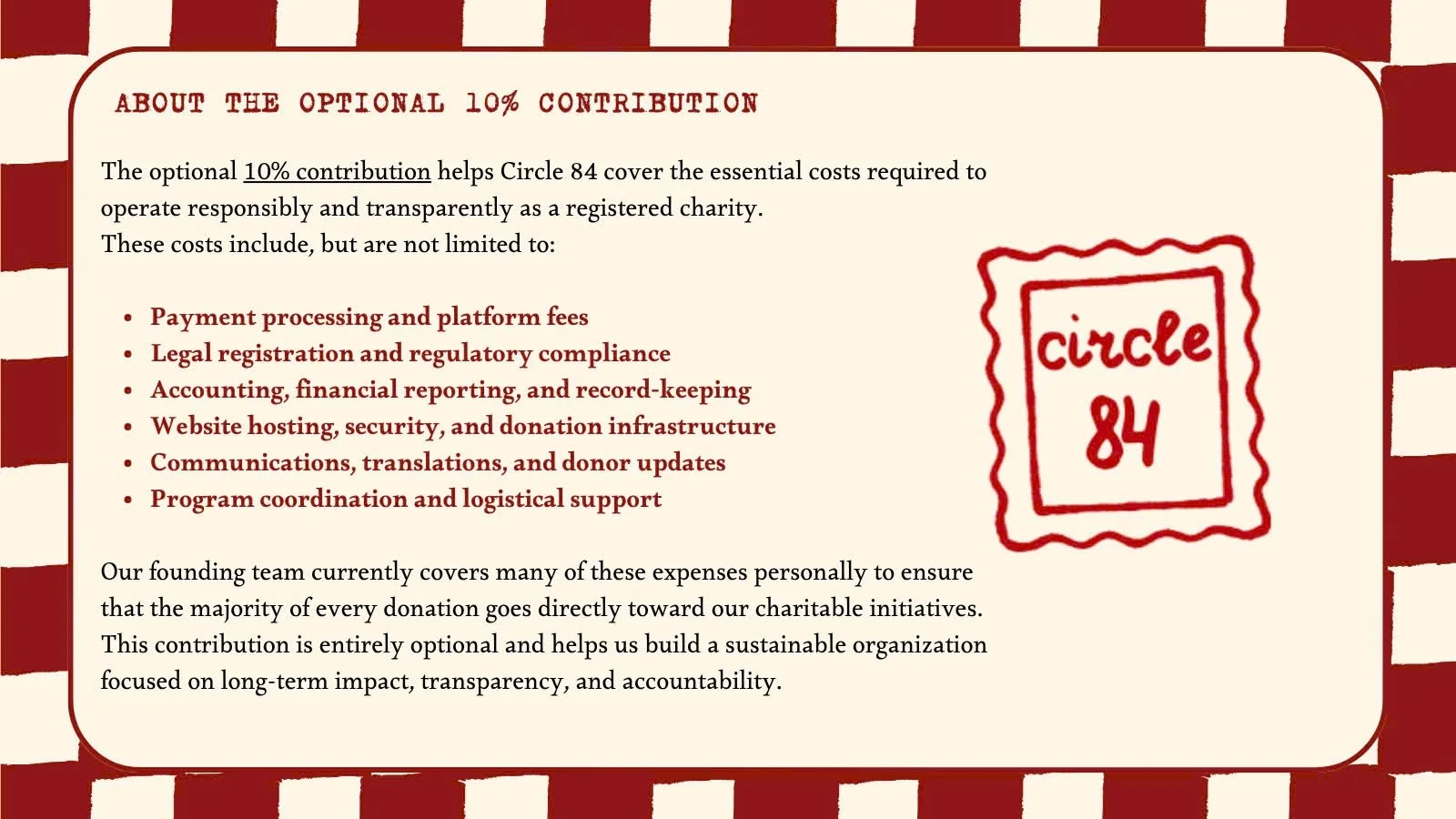 The vast majority of donations go directly toward our charitable programs and community initiatives. A small portion may be used to cover essential operational costs required to run the organization responsibly and transparently.